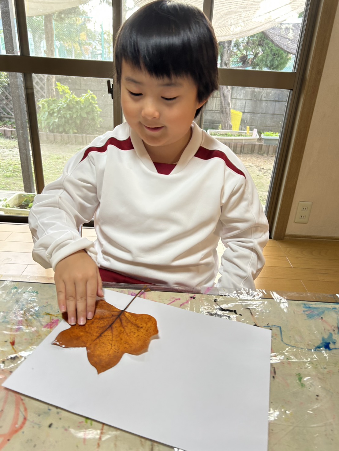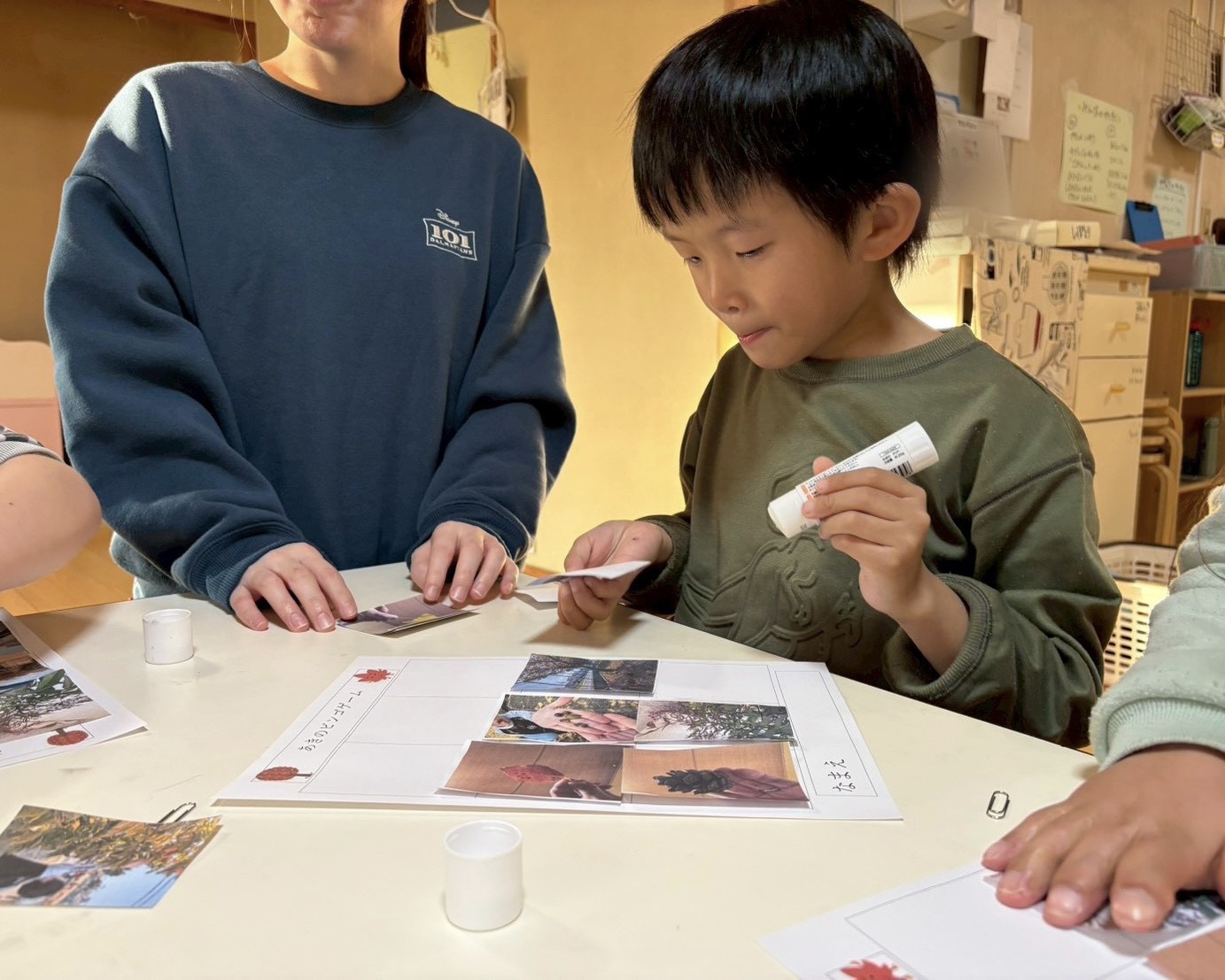 子どもたちが拾ってきた落ち葉や木の実、撮ってきた写真を使ってオリジナルのビンゴカードを自分で作りました!