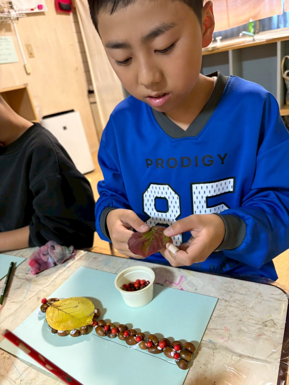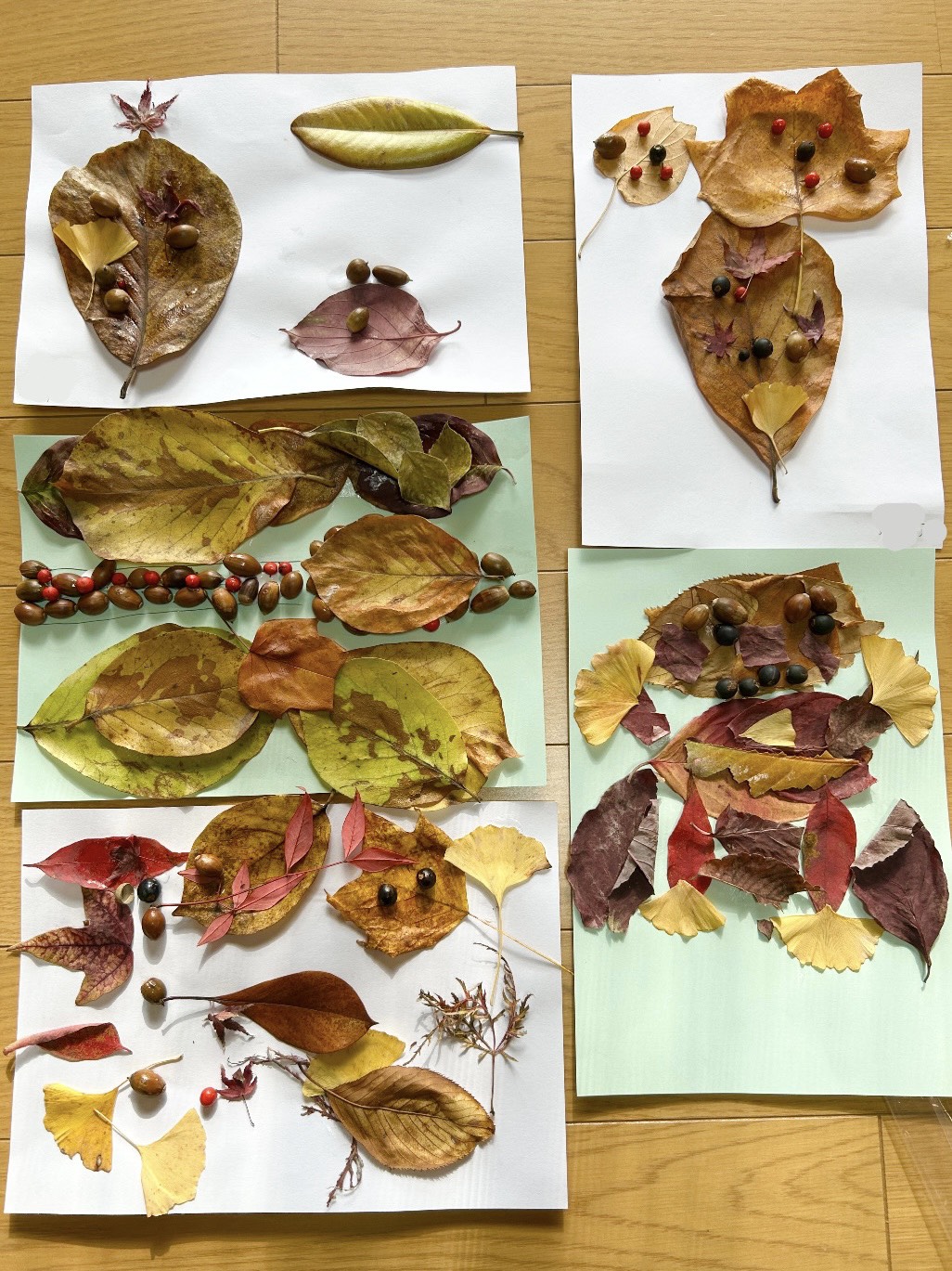 様々な形や色の葉っぱや木の実の中から好きなものを選んで自由に楽しみ、個性あふれる素敵なアートがたくさん出来ました。
