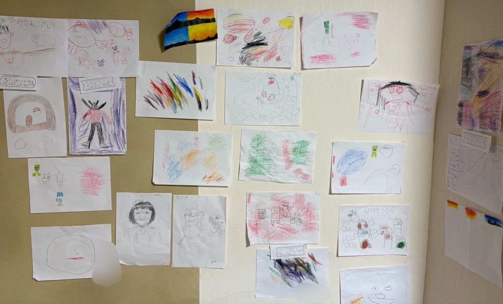 描き終わったあとは、みんなの作品を壁に貼り出し「この絵は誰が描いたの?」「すごく上手!」と、子どもたち同士で自然に声をかけ合う姿も見られ、自由に表現した作品と一緒にとても素敵な時間を過ごしました。