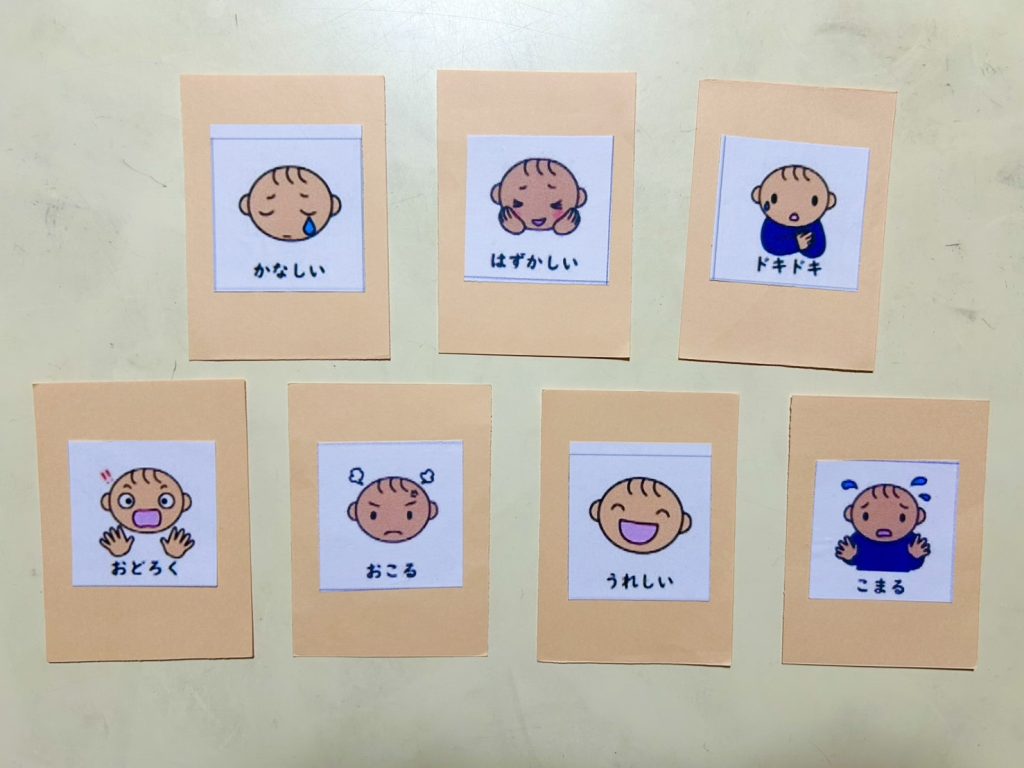「嬉しい」「悲しい」「怒る」など、それぞれの表情を見ながら、「どんな時にこんな顔になる?」と皆で考えながら行います。