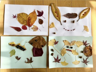 様々な形や色の葉っぱや木の実の中から好きなものを選んで自由に楽しみ、個性あふれる素敵なアートがたくさん出来ました。